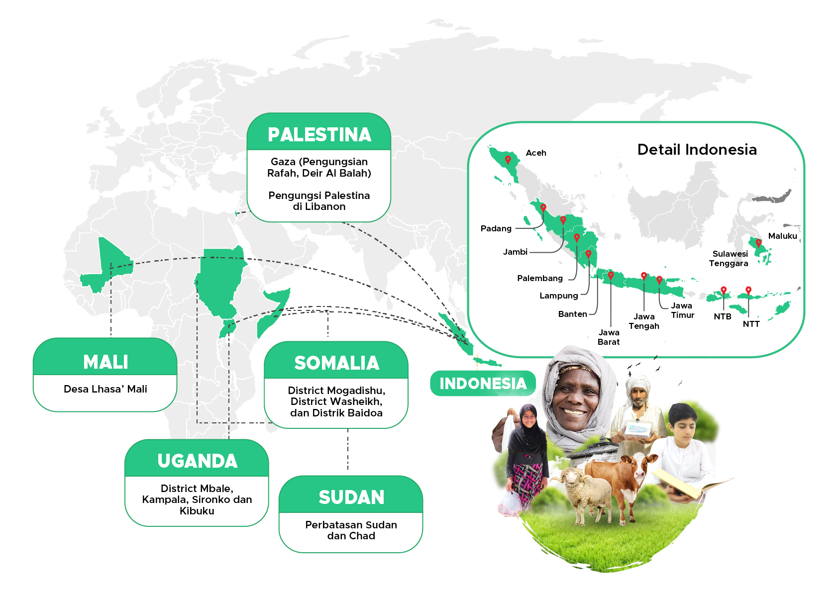 Penyaluran kurban difokuskan ke berbagai wilayah di Indonesia, khususnya Indonesia Timur, daerah 3T (terdepan, terpencil, dan tertinggal), pulau terluar, serta wilayah lain yang membutuhkan. Selain itu, kurban juga disalurkan ke negara-negara muslim yang sedang mengalami krisis pangan maupun krisis kemanusiaan seperti Palestina dan beberapa wilayah di Afrika.